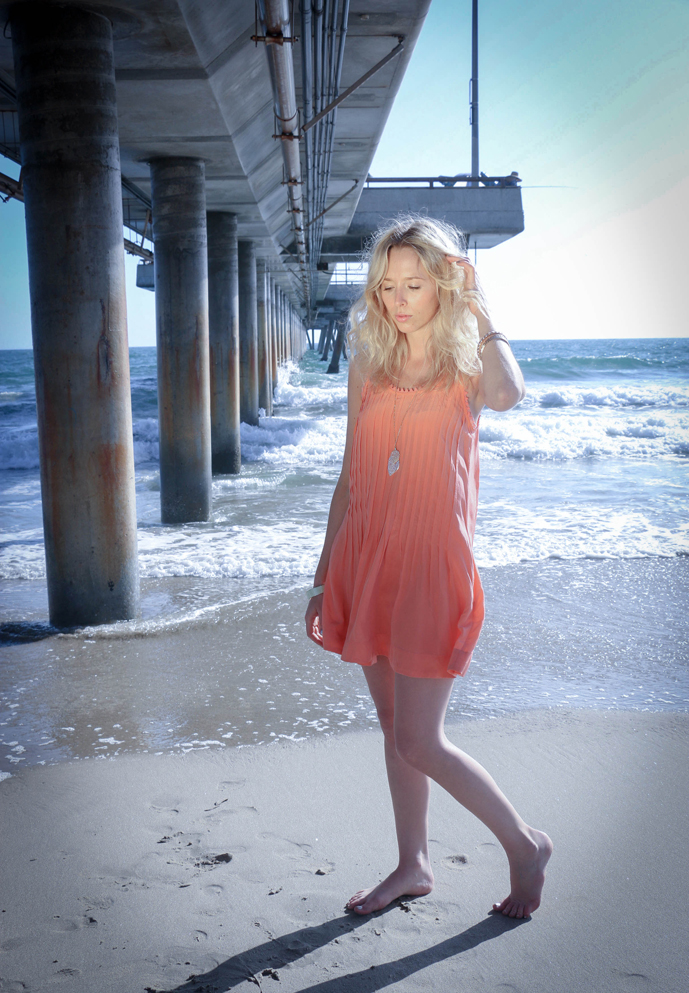 The beach is by far one of my favorites places to spend a relaxing time. Here we are with my friend Vicky, the photographer, on the Venice Pier, one of the most attractive places to hang out here in LA. This magical place is full of surfers, happy people and close to many restaurants. Today I`m wearing this light coral pleated dress from “Club Monaco”. Club Monaco develops amazing patterns, beautiful prints, standing out a minimal, chic and effortless style. Nowadays fashion is all about selection and optimizing time, you can definitely achieve that wearing one piece that already speaks by itself. Adding accessories for the “touch” is a must : – ) Hope you guys have a great week! <3